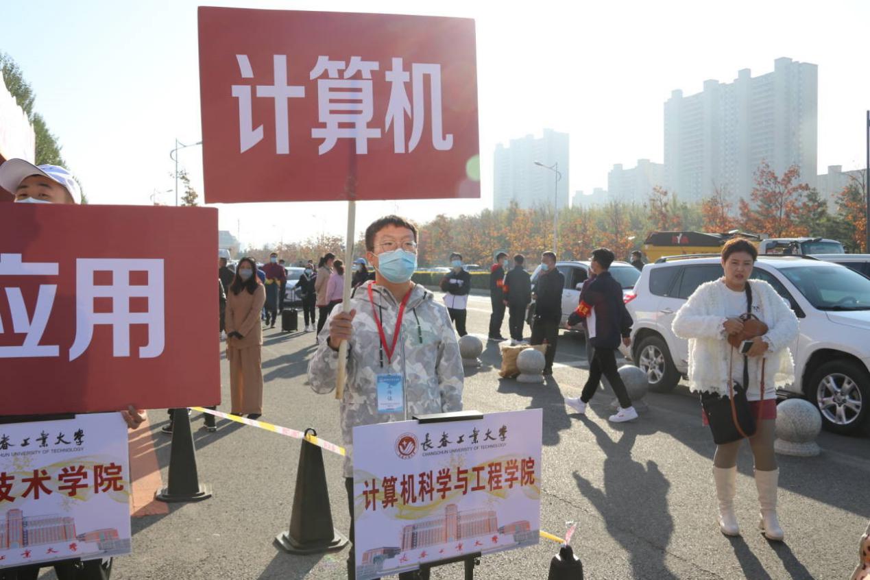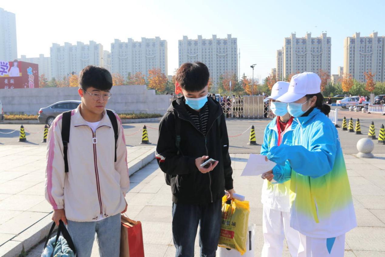 志愿者在校外为新生及家长提供引导服务