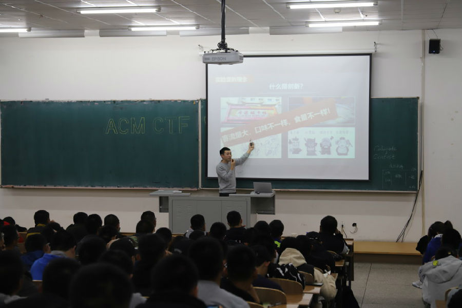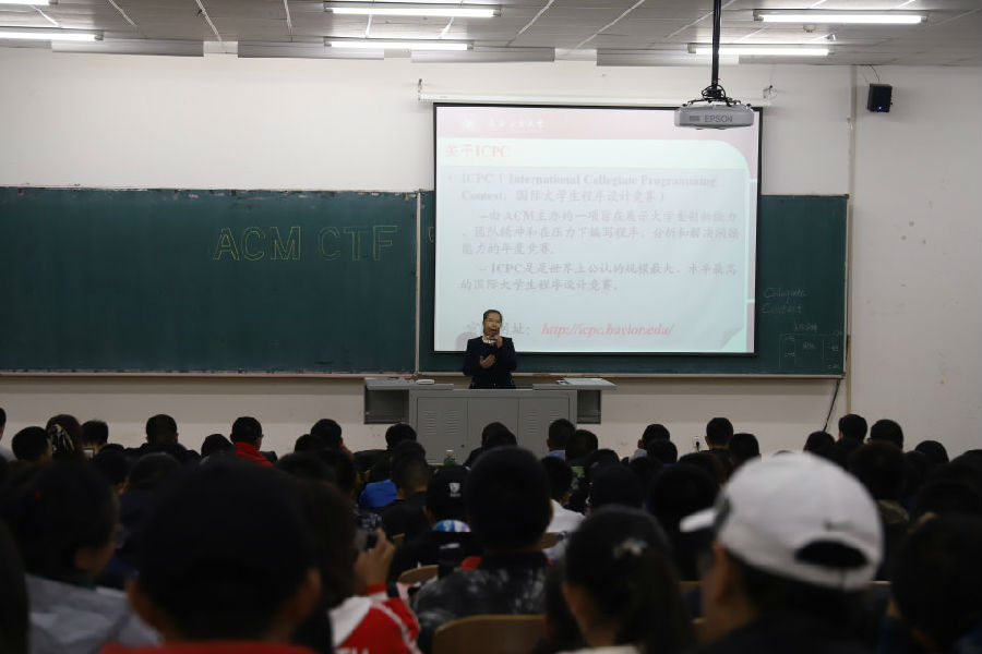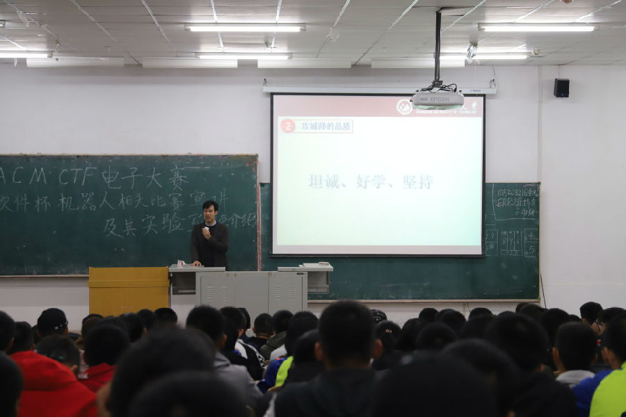 于10月16日晚6:00在北湖校区西阶102、202教室分别召开了电子大赛、ACM、CTF、软件杯、机器人等学科相关竞赛宣讲及其实验室特色介绍会。电子信息工程系郭昕刚、网络工程系刘冰、ACM实验室王涛、信息安全实验室付晓琳、以及创新实验室郭建伟等几位老师出席了本次会议,2018级全体学生参加了本次宣讲会。