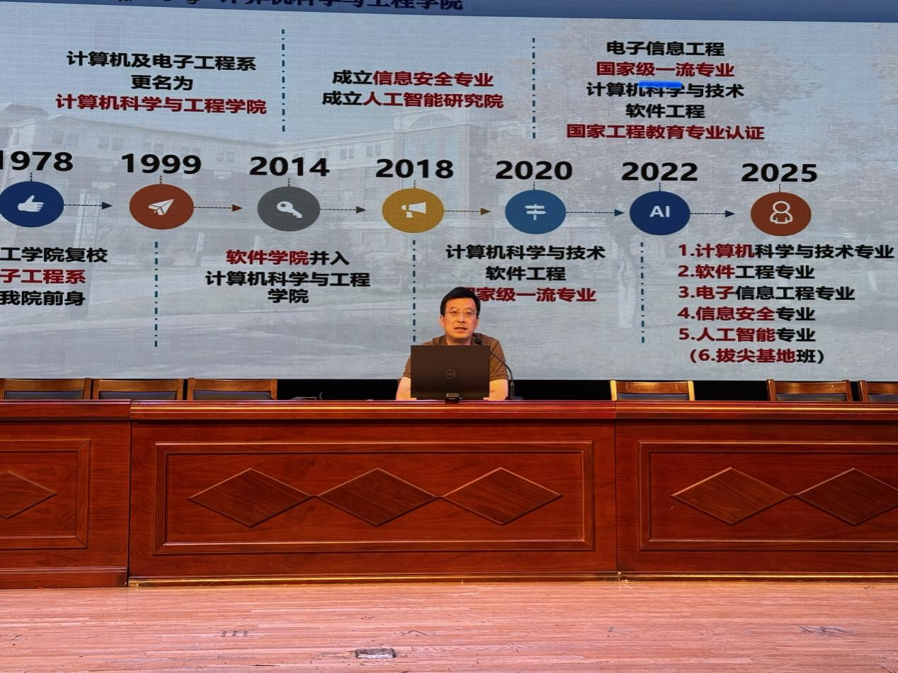 发展历程、专业建设与学科特色”为主线,为新生带来一场内容丰富、视野开阔的专题讲座。他结合当前人工智能、大数据等前沿科技发展趋势,系统阐述了计算机相关专业的广阔前景与发展机遇,并围绕大学期间如何有效平衡学习与生活、提升自我管理与学术素养、科学进行职业规划等实际问题,提出了务实而中肯的建议,助力新生从容启航、稳健前行。