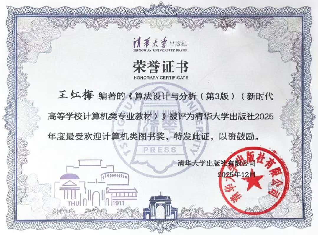 本网讯(通讯员 刘惠春)近日,清华大学出版社正式公布2025年度图书评选结果,由王红梅教授编著的《算法设计与分析(第3版)》(新时代高等学校计算机类专业教材)凭借扎实的内容质量、广泛的教学应用及读者好评,成功斩获“2025年度最受欢迎计算机类图书奖”。