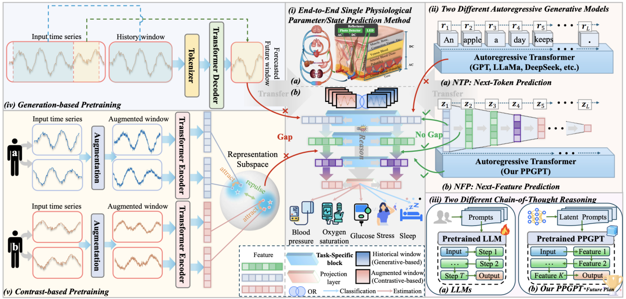 该研究聚焦可穿戴设备中的光电容积脉搏波(PPG)信号建模,探索大语言模型词元预测机制向生理信号分析的迁移。针对预训练目标与下游生理参数估计、状态识别任务之间的语义鸿沟,团队提出首个基于序贯征元预测机制的信号大模型PPGPT,将离散文字序列建模拓展为连续生理信号时空演化轨迹的概率建模。模型采用双流编码器联合刻画时序动态特征与局部-全局形态模式,并基于包含16亿数据点的大规模混合数据集进行两阶段训练。实验结果表明,PPGPT在F1分数上显著优于现有方法16.5%,平均绝对误差降低25.9%,并展现出优异的少样本学习能力。